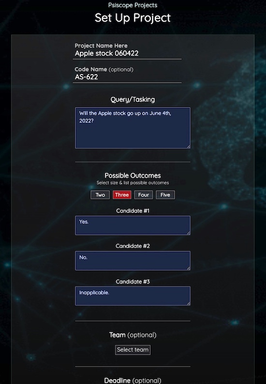 Beyond the on-chain (and off-chain) trials, we have a special setup called “projects” – traditionally known as “associative remote viewing” (ARV) – all about applying psi directly to real-world situations, no longer focused on proving psi but actually using it “outside the lab” thereby injecting the new reality into the existing reality. This is where the rubber meets the road, and if successful, where we begin to make a tangible impact on human society.